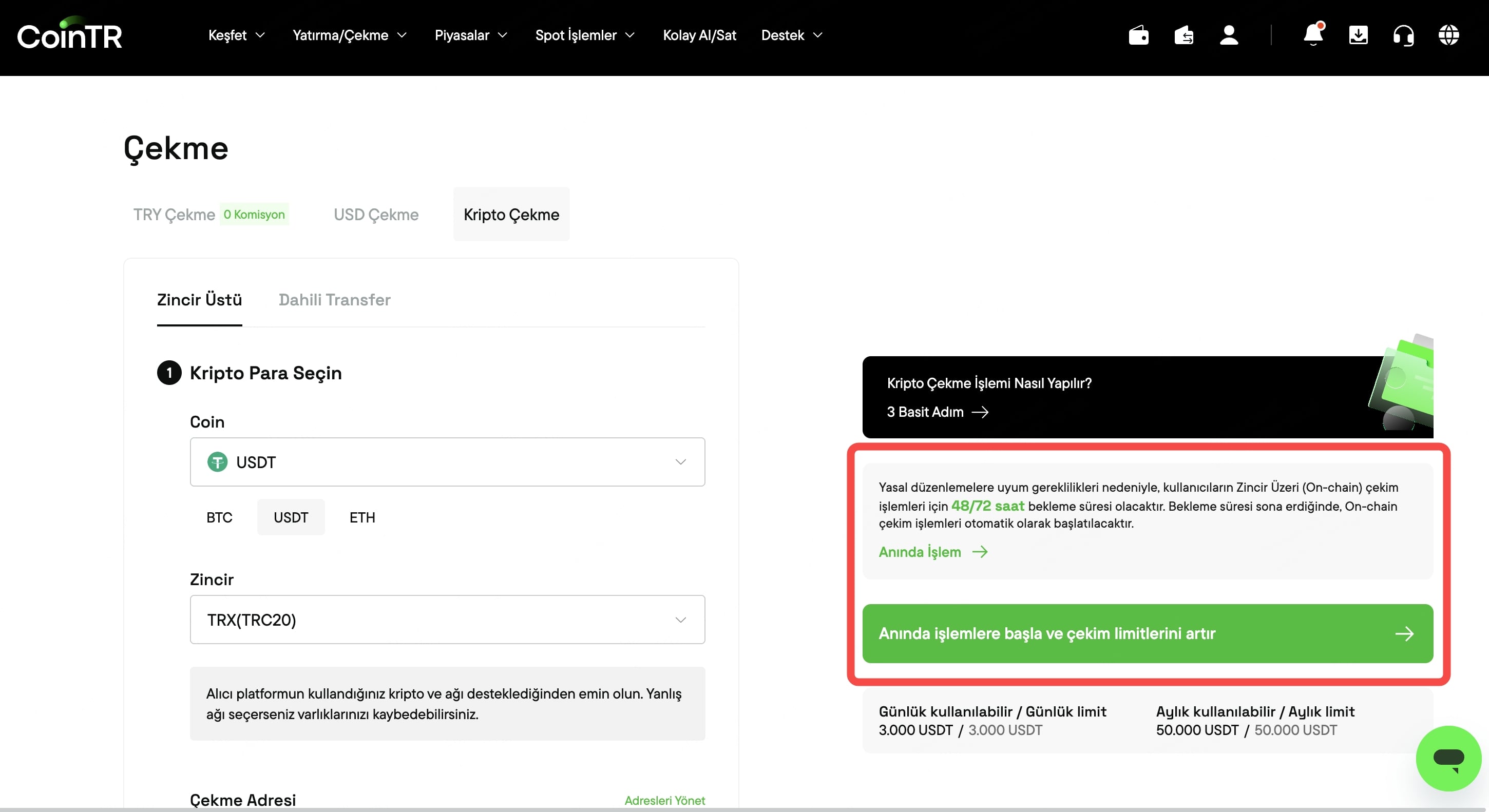 ⚠️ Not: Bu çekim limitleri, statü yükseltme işlemini tamamlayan ve gerekli Seyahat Kuralı belgelerini paylaşan kullanıcılar için geçerli değildir. Doğrulama süreci onaylandıktan sonra kullanıcılar, bu limitlere tabi olmadan işlemlerine devam edebilir.